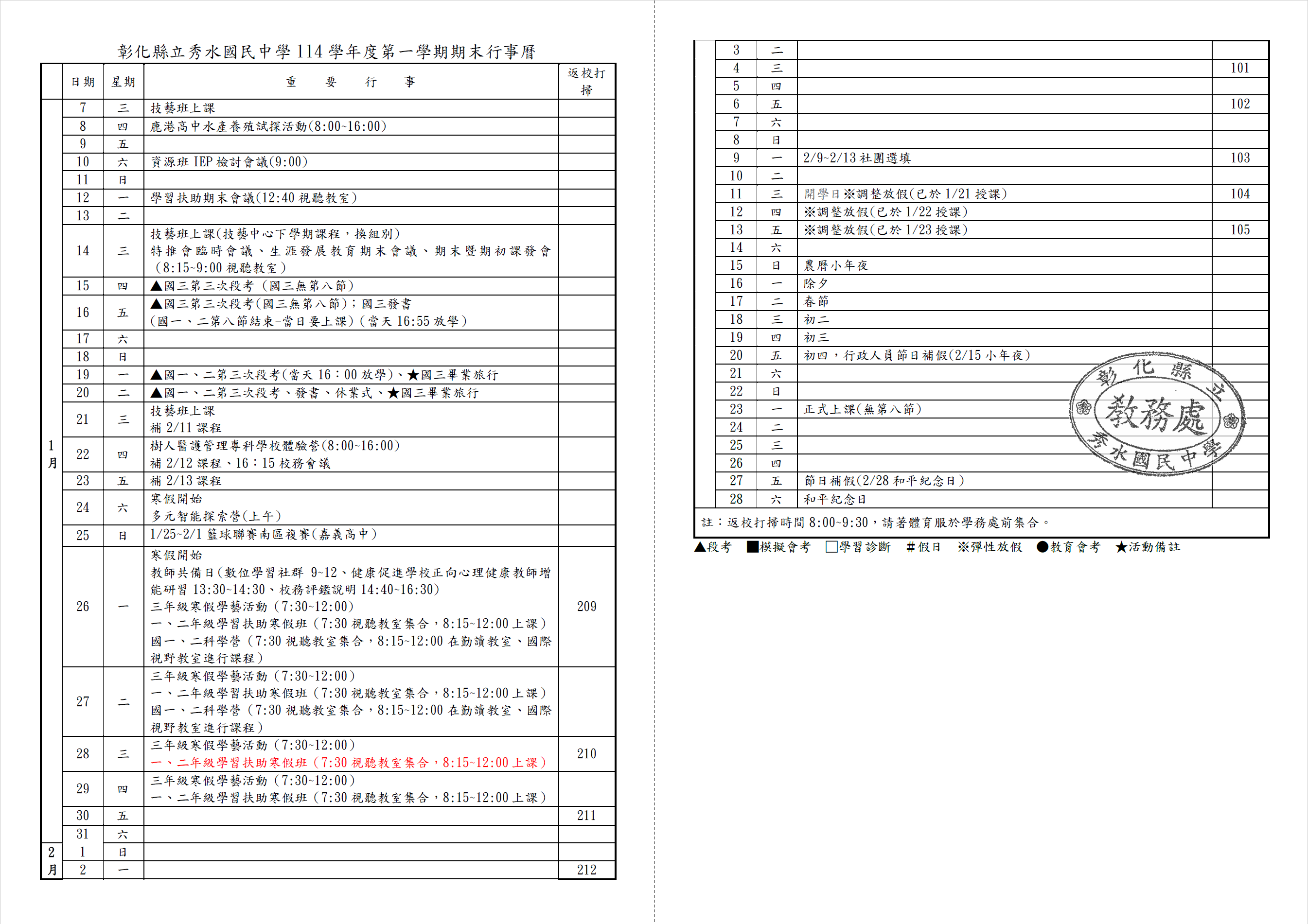 114學年度第一學期期末行事曆【PDF檔下載】 【PNG檔下載】【 Google Calendar】