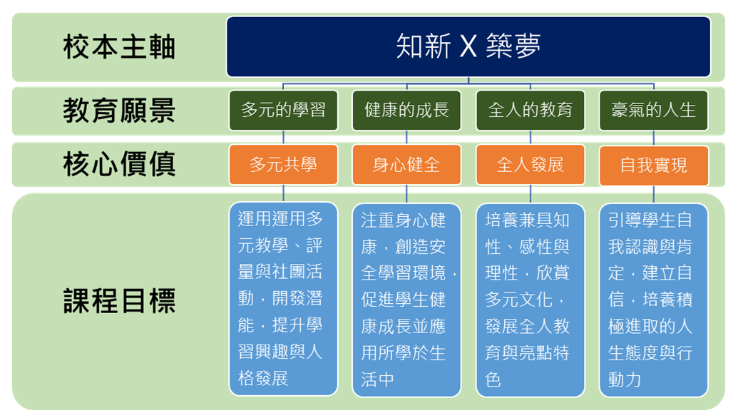 本計畫期程為 114學年度至 117學年度,旨在引領學校邁向更優質、創新的發展。本校以「知新 X 築夢」為核心教育願景,勾劃秀中學子的未來藍圖: